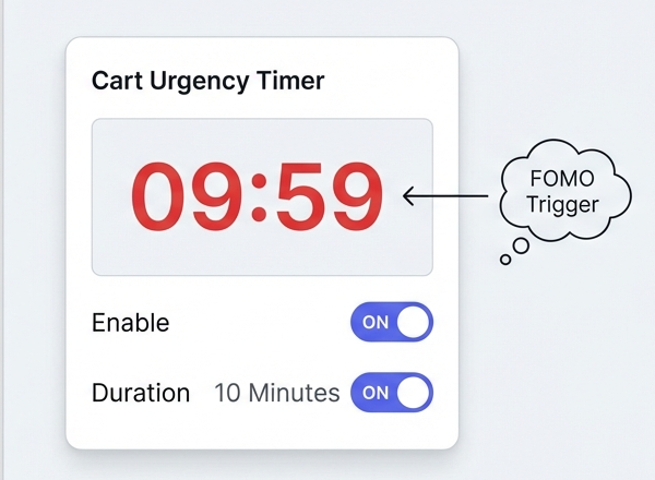 Enable the cart urgency timer and progress bar. Customize colors and goals like free shipping, discounts, or free gifts to motivate customers to proceed.