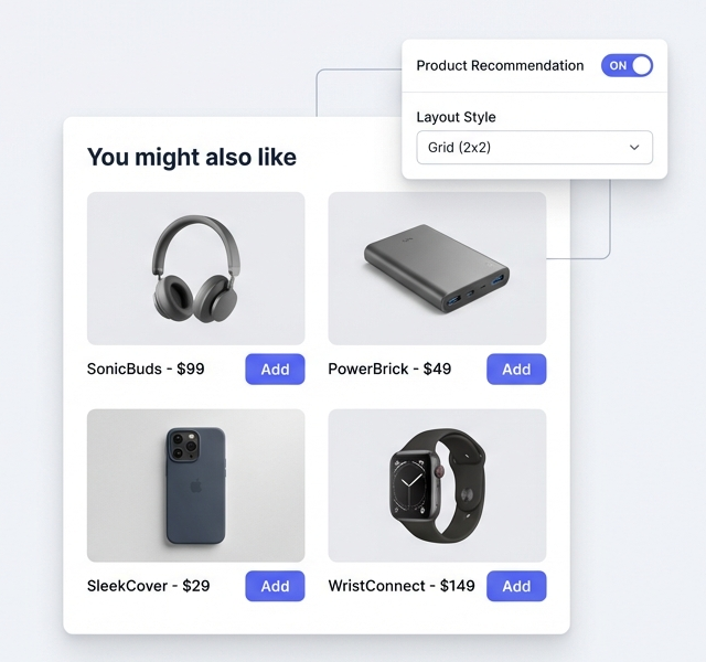 Turn on product recommendations and configure rules to show relevant items. Choose layouts that fit your store's design.